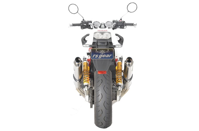 マフラー素材にはチタン合金を採用し、細身の異形オーバルツインチタン