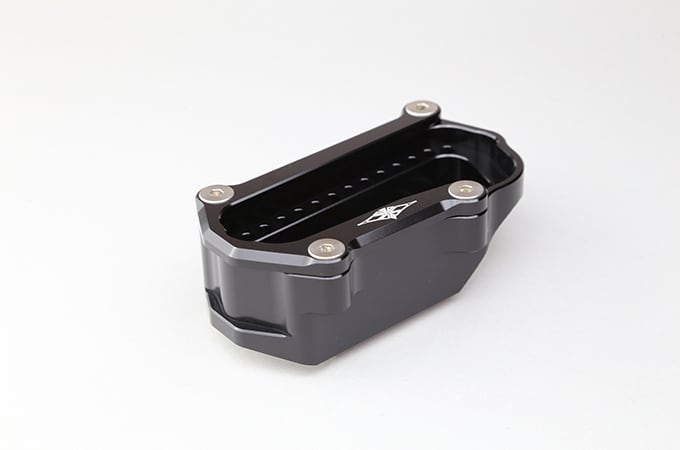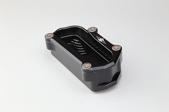 サイドスタンド使用時に、車体の傾きを抑えることで取り回し性を向上させます。スタンドの接地面積も増大するため、軟弱な路面に停車した場合でも、サイドスタンドのめり込みを防止します。高さはノーマル比で約23mmアップ。ジュラルミン削り出し製、ブラックアルマイト仕上げ。