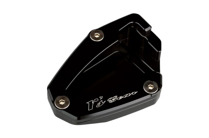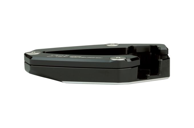 サイドスタンド使用時に、車体の傾きを抑えることで取り回し性を向上させます。スタンドの接地面積も増大するため、軟弱な路面に停車した場合でも、サイドスタンドのめり込みを防止します。高さはノーマル比で約4mmアップ、面積は約1.6倍。ジュラルミン削り出し製、ブラックアルマイト仕上げ。